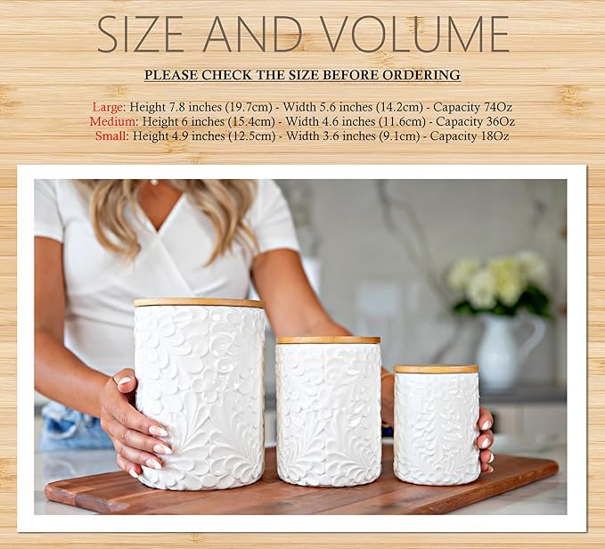 - Storage Only Capped by Your Imagination: Our farmhouse canisters sets for the kitchen include a Large (74 oz.), Medium (36 oz.), and Small (18 oz.) size, making them the perfect for sugar, tea, coffee, pasta, nuts, beans, spices, cereal, and more