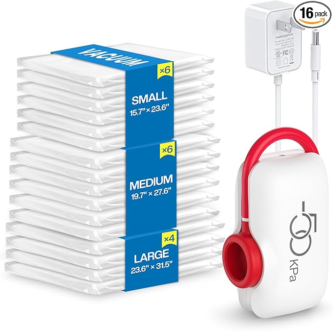 16 Pack Vacuum Storage Bags for Travel – Vacuum Seal Bags for Clothing – Space Saver with High Pressure Electric Pump, Compression Packing for Luggage and Suitcase