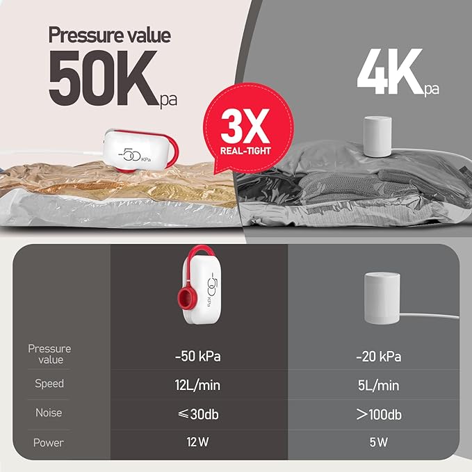- Extreme Compression: With the upgrade -50 kPa high pressure electric pump, allows you to exhaust the air in the vacuum bag super fast within 25 seconds, save your time and effort, and organize your clothes more easily
