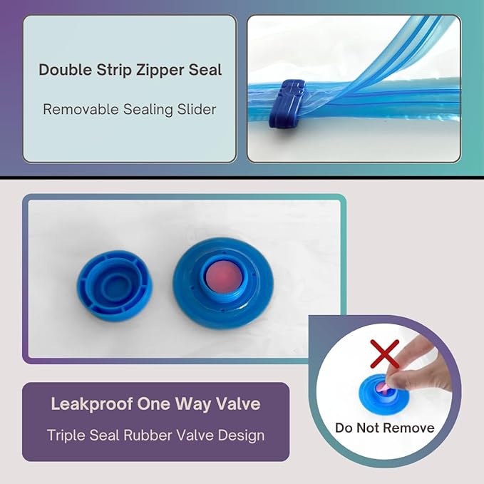 - Easy to Use: Simplicity is key with our vacuum bags. Just place your items inside, seal with the included reinforced zip sliders, and pump out the air using either the provided compact ePump or your household vacuum cleaner