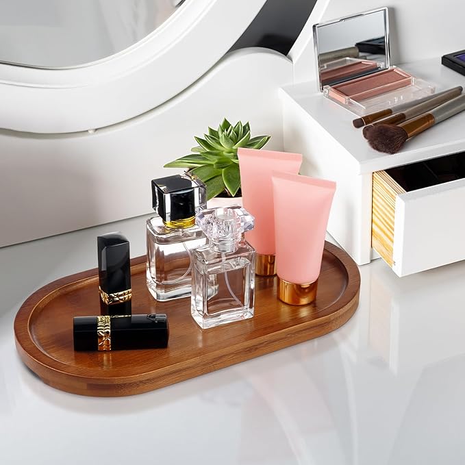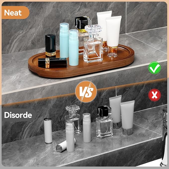 - 【Premium Bamboo with Lacquer Finish】 Made from natural bamboo and finished with a smooth, water-resistant lacquer, this vanity tray is durable, easy to clean, and perfect for daily use in humid environments like bathrooms and kitchens