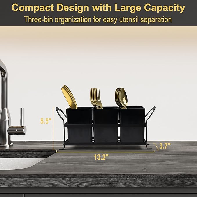 - FUNCTIONAL UTENSIL ORGANIZER: The three-piece set is built in a handy metal caddy with a compact measurement of 13.2" ( 33.5 cm ) L x 3.7" ( 9.4 cm ) W x 5.5" ( 14 cm ) H and each of the containers can be removed separately to wash or refill, the black rectangle holder can equip with a surprisingly large amount of cutlery, it is good idea to refresh a cluttered kitchen counter and looks fancy pants at parties and entertaining by this stylish silverware holder
