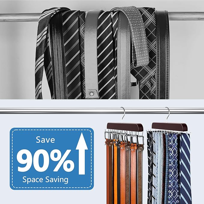 - Sturdy Wood & 360°Rotating Hook:Our tie and belt hanger features metal hooks and a sturdy structure for durability.We use pure natural wood processing, high quality and durable. The hook can rotate 360° for easy operation and is compatible with most sizes of hanger rails and closet rods.