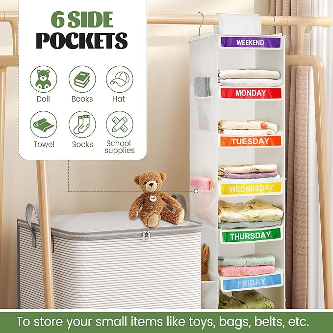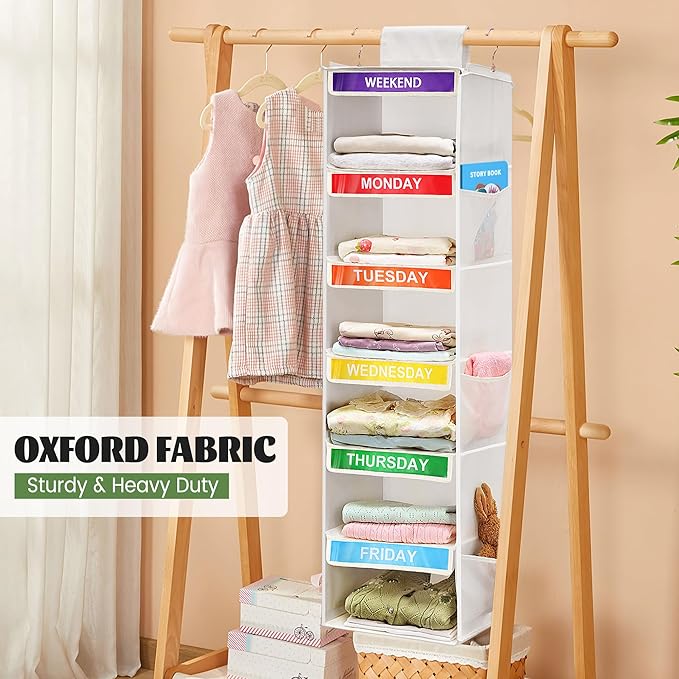 - Insertable Weekly Labels: Hanging closet organizer comes with clear tabs on each shelf to insert labels, include 6 weekly labels in different colors (from Monday to Friday and weekends), According to the date, plan out outfits ahead of time, save lots of time in the morning