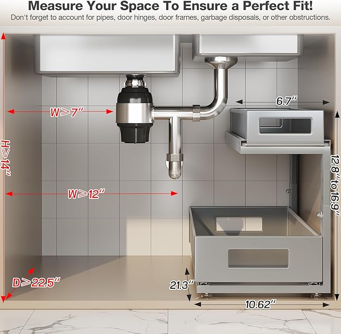 - 【Height Moves to Fit Your Storage Needs】Crafted with an L-shaped design and 5 adjustable heights(12.8–16.9 in),under sink pull out organizer seamlessly adapts to your cabinet, flexibly adjusting its height to navigate around pipes while maximizing vertical storage.