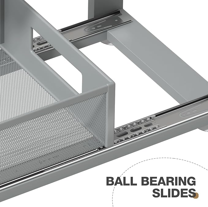 - 【Supreme-Smooth Glides】Built with heavy-duty ball-bearing slides,pull out cabinet organizer glides out smoothly and quietly,even when storing bottles,detergents,or heavy cleaning supplies.