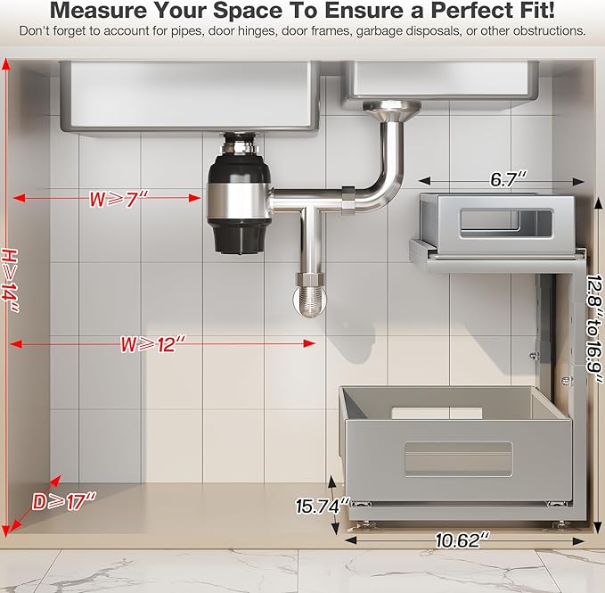 - 【Height Moves to Fit Your Storage Needs】Crafted with an L-shaped design and 5 adjustable heights(12.8–16.9 in),under sink pull out organizer seamlessly adapts to your cabinet, flexibly adjusting its height to navigate around pipes while maximizing vertical storage.