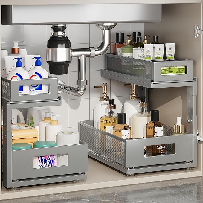 2 Pack 15.74IN-Depth Under Sink Organizer With Next-Gen Ball-Bearing Slides,2-Tier Pull Out Cabinet Storage,Height Adjustable Drawer Shelf for Bathroom,Kitchen,Laundry,Cabinet,Pantry-Gun Gray