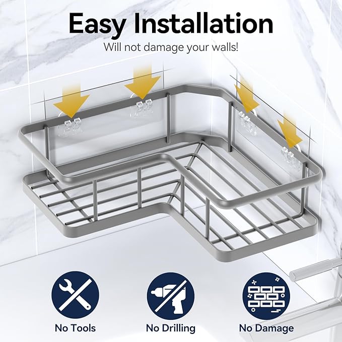 - EASY INSTALLATION:Install this shower organizer corner shelf in just 3 steps (Clean - Stick - Hang) without drilling. Our clear adhesive can be used on tile/glass/marble walls and rest for 24 hours to place items