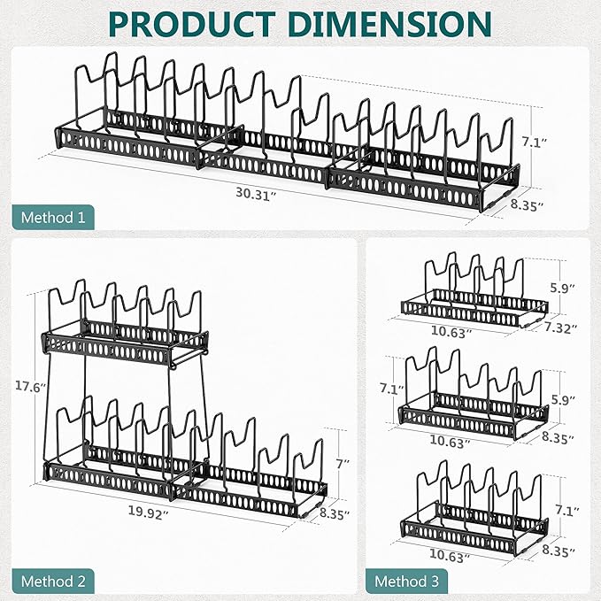 - 3-in-1 Customizable Pot Rack:Our pots and pans organizer under cabinet offer 3 DIY method.Expandable pan organizer(Length 10.63"-30.31"),3 individual pot lid organizers(Length 10.63"),and 2-tier design to maximize vertical space(Height 7.1"-17.6").Adapt layouts freely via modular design