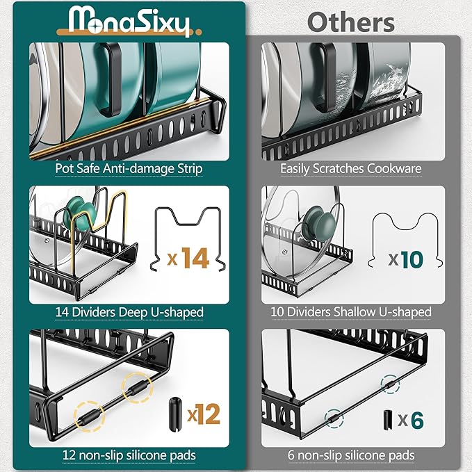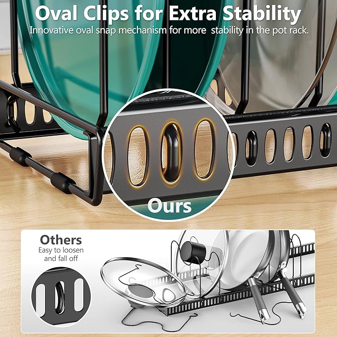 - Innovative Elliptical Slot Design:The unique elliptical slot design enhances stability,Prevents dividers from wobbling or popping out when accessing cookware.The 12 non-slip rubber pads prevents pot lid holder from moving and ensuring it stays securely in the cabinet
