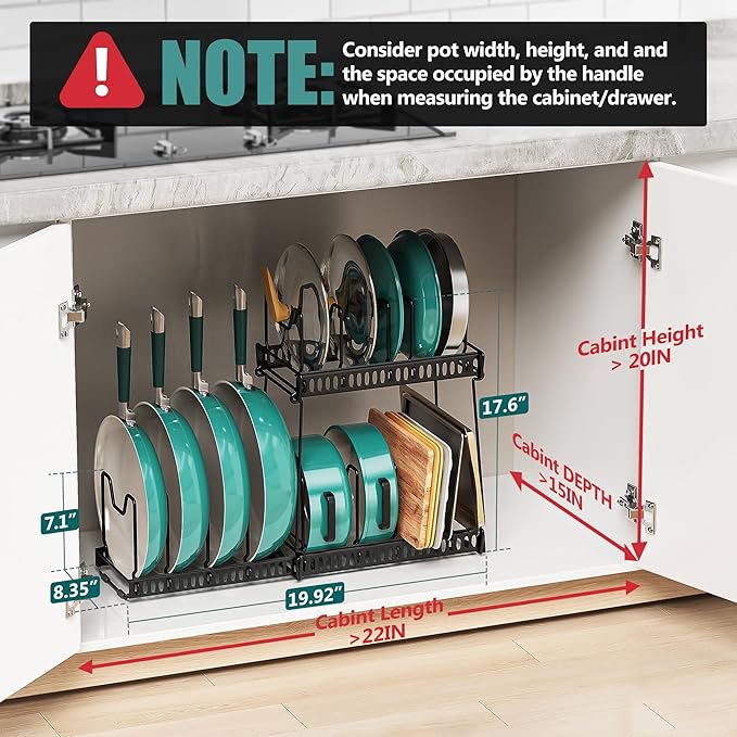 - IMPORTANT SIZE REMINDER:Before making your purchase,please ensure you check the dimensions of the pot rack carefully.Note:Consider pot width,height,and and the space occupied by the handle when measuring the cabinet/drawer.This will help you avoid placement issues and save you valuable time