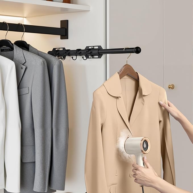 - 【QUICK & SIMPLE INSTALLATION】 Set up the pull-out valet rod in just 60 seconds! With 4 included screws, it’s drill-ready and fits existing holes for hassle-free mounting.