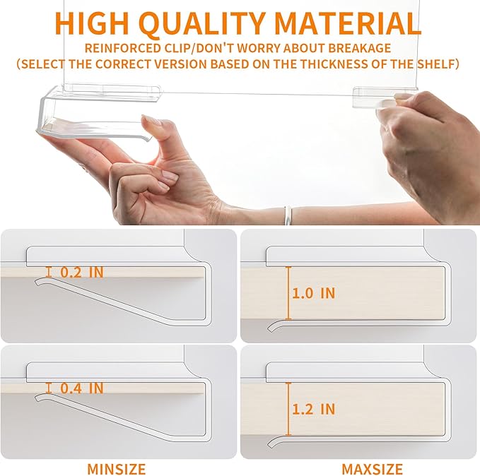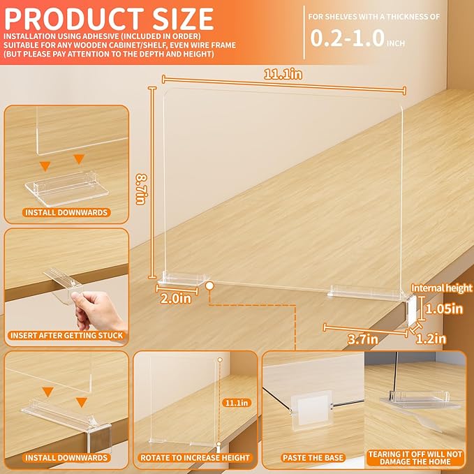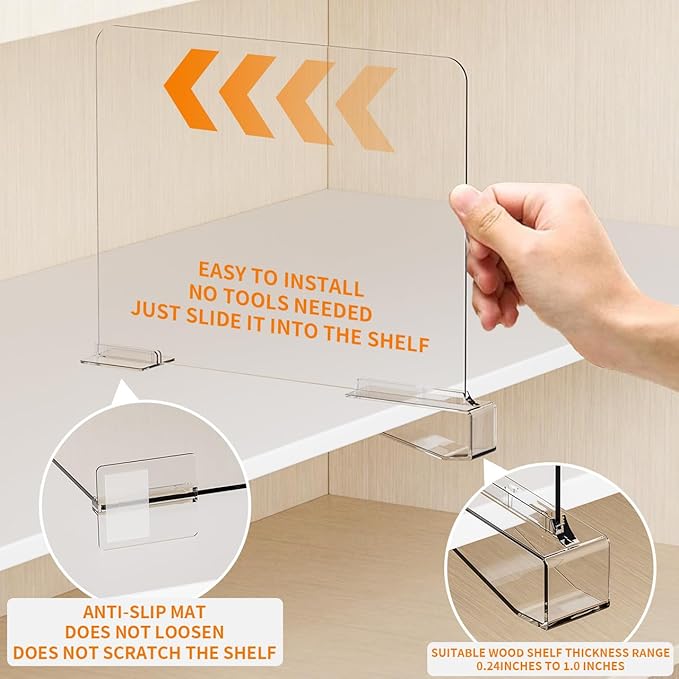 - 【Easy installation/Durable Quality】Our acrylic shelf dividers offer versions that are compatible with Cabinets thicknesses of 0.2-1 Inch or 0.4-1.2 ,The clips on the bottom are reinforced and Choose the appropriate version without worrying break and the anti slip silicone pad pasted at the bottom perfectly protect your wooden shelves and cupboard
