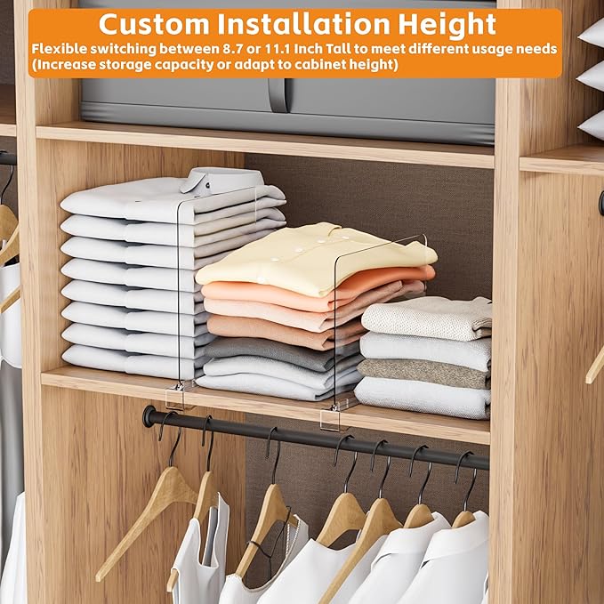 - 【Exclusive Design/Adjustable Height】 Our closet dividers can switch between adjusting the height to 8.7 and 11.1 inches Tall by flipping the installation,In order to meet the needs of increasing storage capacity or adapting to different heights of cupboard