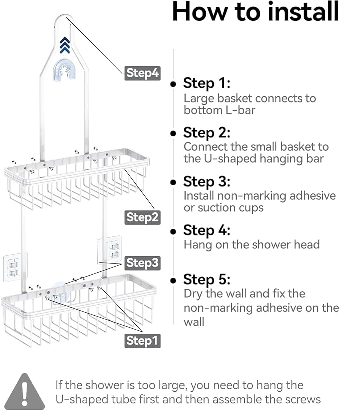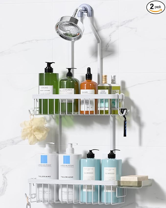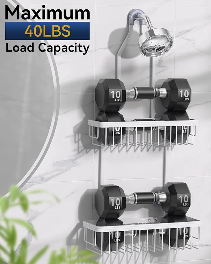 - Ergonomic Design & Universal Fit: Unlike other shower hangers, our upgraded shower holder features an expanded height between shelves, which allows the lower tier to accommodate taller and larger bottles without interfering with the upper shelf or your showerhead. Also, the bathroom organizer fits most-sized showerheads