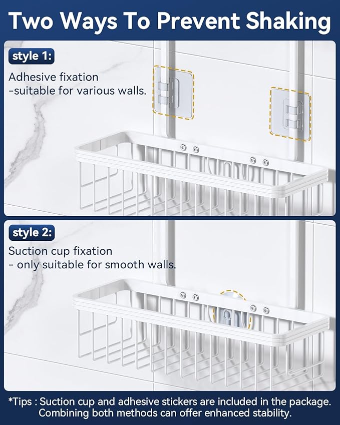 - Anti-Slip & Anti-Swing: Equipped with a U-shaped rubber for the top, combined with 2 adhesives and a suction cup for keeping this hanging shower rack firmly in place without shaking. The over shower head caddy holds up to 40 lbs of toiletries without losing balance even when you are taking or putting body bottles