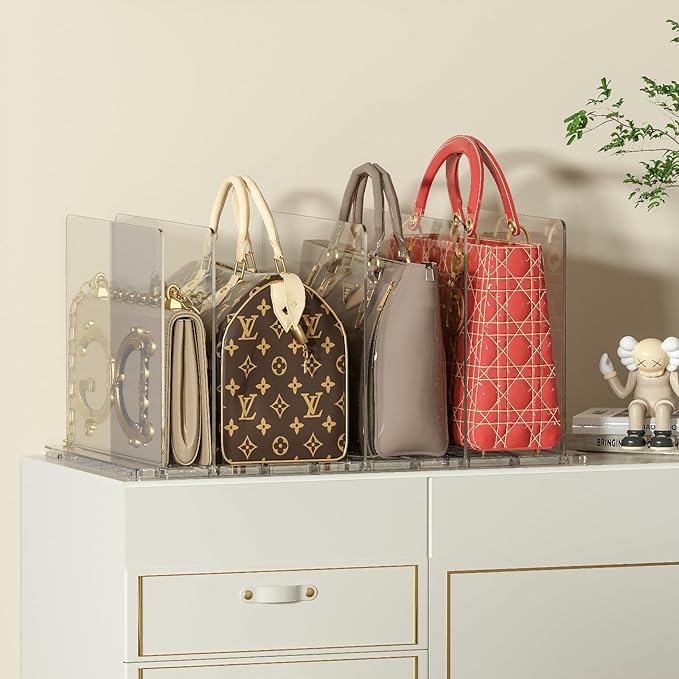 - STAY ORGANIZED WITH ADJUSTABLE SHELVES: Keep your closet stays clean and tidy with our purse divider set! Adjust divider spacing to fit handbags,evening bag, wallets, or even books.(2 sets of 4 dividers)
