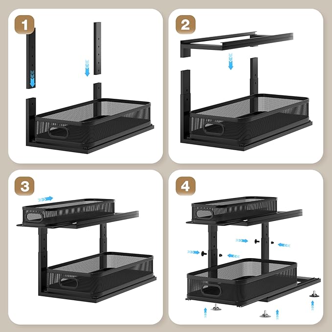 - 【2-Tier Pull Out,No More Strenuous Bending】Both upper and lower drawers glide out effortlessly, with no noise or jamming, giving easy access to items at the back of your cabinet without crouching or digging through clutter. Built-in stoppers prevent over-pulling, while suction cups at the base enhance stability for worry-free use.
