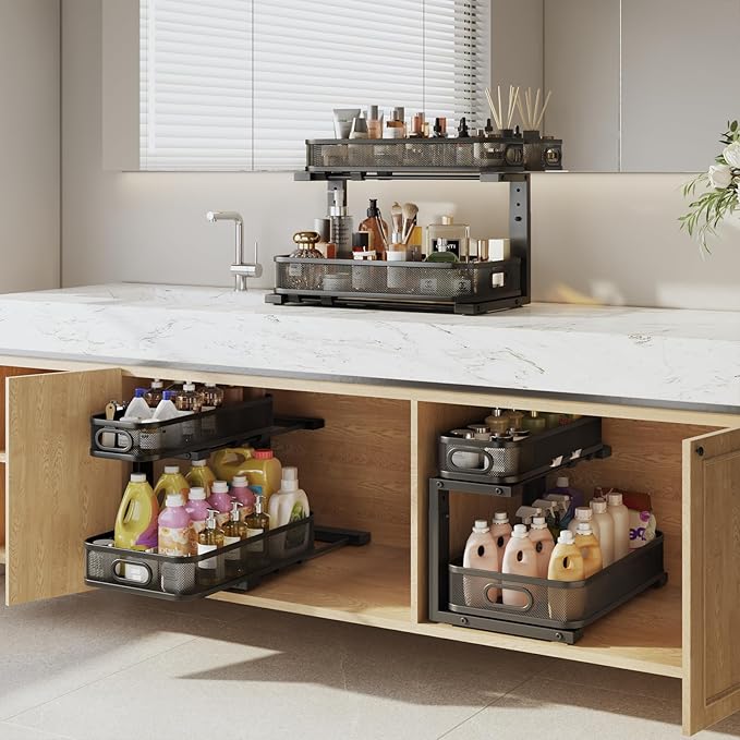 - 【Versatile Storage Solution】Designed with elegant mesh styling and double sliding tiers,undersink organizers blends seamlessly into any space—whether in the kitchen, bathroom,laundry,study,or living area.Perfect for storing seasonings,toiletries,books,or snacks,Sleek and functional.