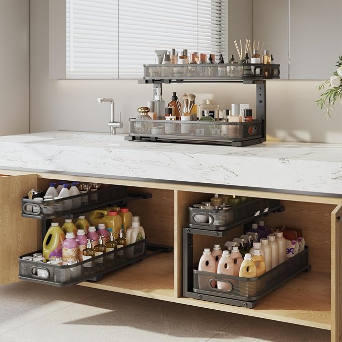 - 【Versatile Storage Solution】Designed with elegant mesh styling and double sliding tiers,undersink organizers blends seamlessly into any space—whether in the kitchen, bathroom,laundry,study,or living area.Perfect for storing seasonings,toiletries,books,or snacks,Sleek and functional.