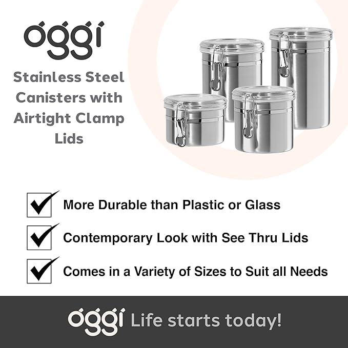 - BREADTH OF SIZES: The s/4 OGGI Stainless Steel Kitchen Canisters has a useful variation of sizes to suit your needs. Capacity: 26oz, 36oz, 47oz, 62oz.