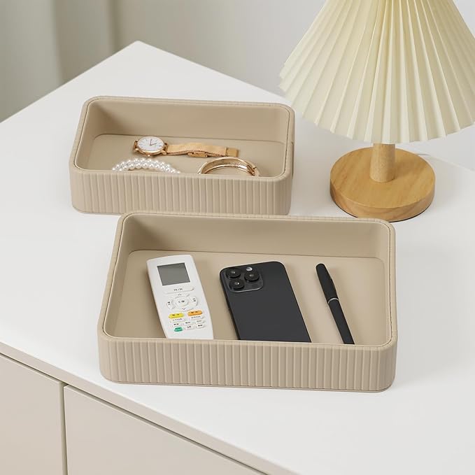 2 Pack Nightstand Organizer Tray, Decorative Perfume Valet Tray Trinket Dish Catch All Purse Key Bowl, PU Leather Coffee Table Trays for Vanity Dresser Bedside Bathroom Countertop (Beige)