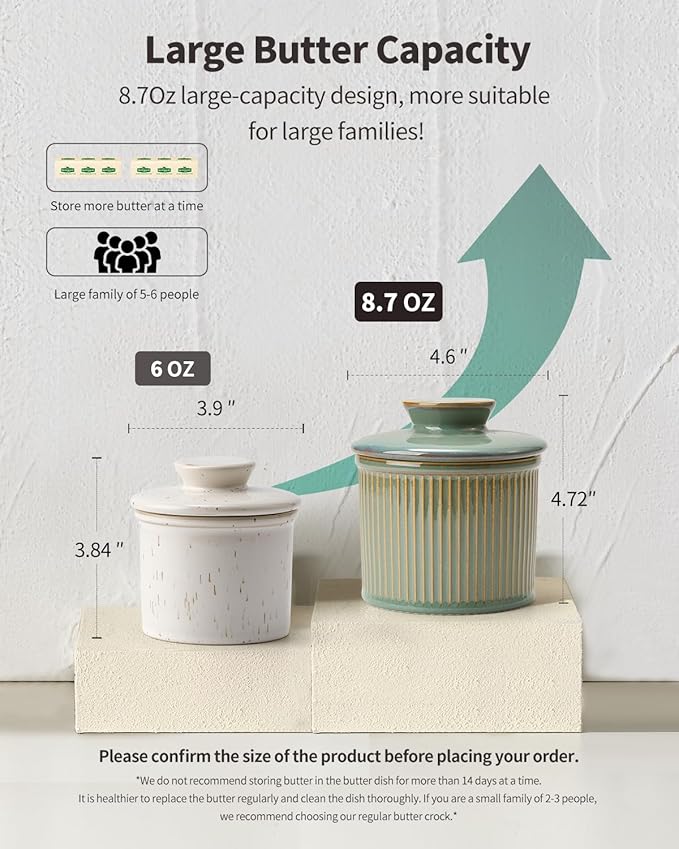 - Extra-Large Capacity: Designed to hold enough butter for big families and parties,XELA large butter crock can easily store 5-6 servings at once(8.7 oz). Say goodbye to running out of soft and spreadable butter too quickly or struggling with small butter containers.