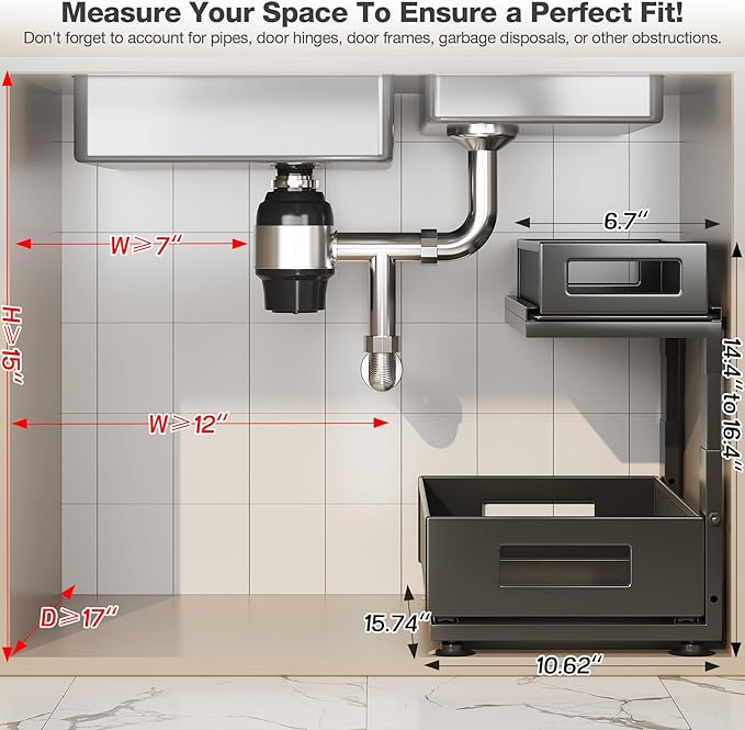 - 【Height Moves to Fit Your Storage Needs】Crafted with an L-shaped design and 2 adjustable heights (14.4–16.4 in),under sink pull out organizer seamlessly adapts to your cabinet, flexibly adjusting its height to navigate around pipes while maximizing vertical storage.
